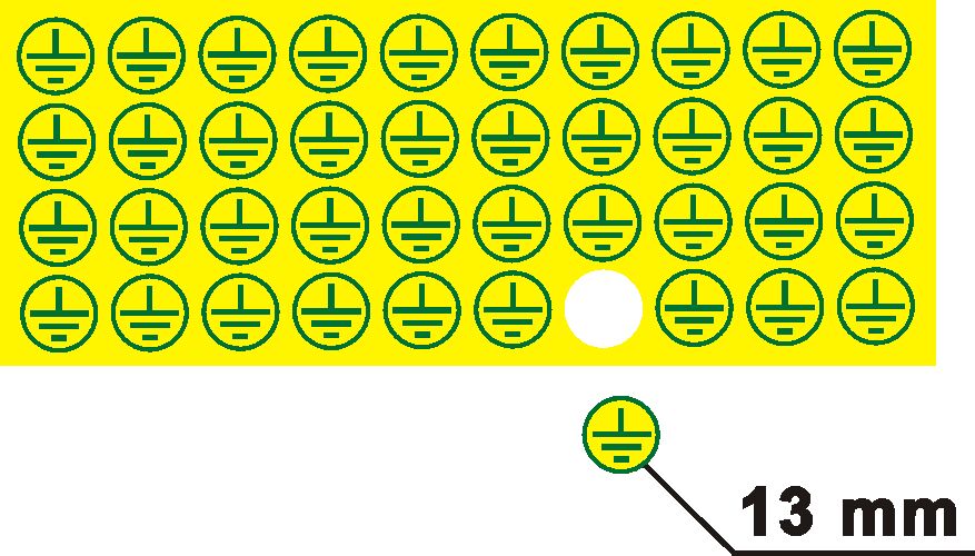 Drobná, ale technicky zásadní bezpečnostní samolepka se symbolem ochranného uzemnění. Je určena pro přesné značení připojovacích bodů ochranných vodičů přímo na elektrických zařízeních, v rozvaděčích a na kovových kostrách strojů.
